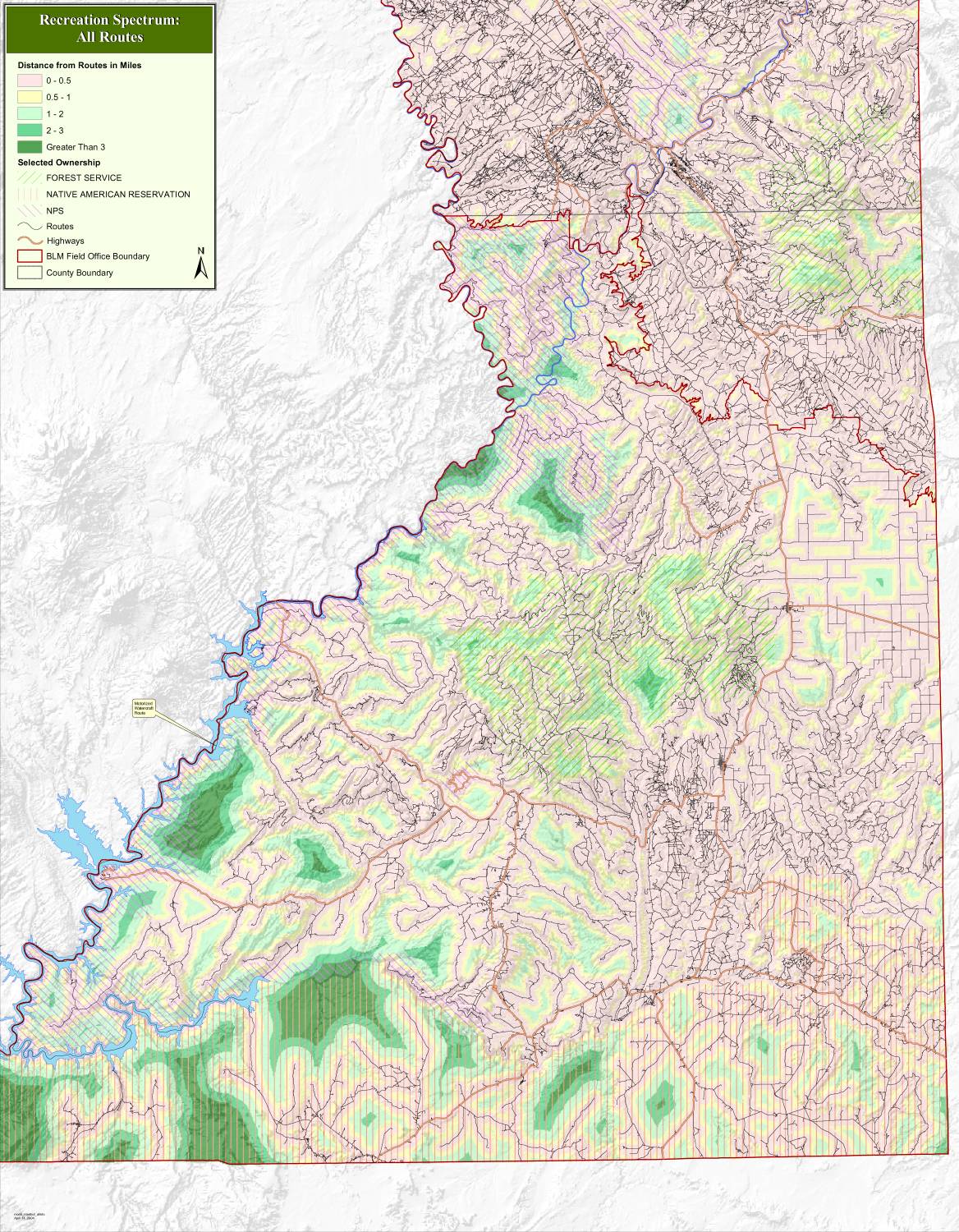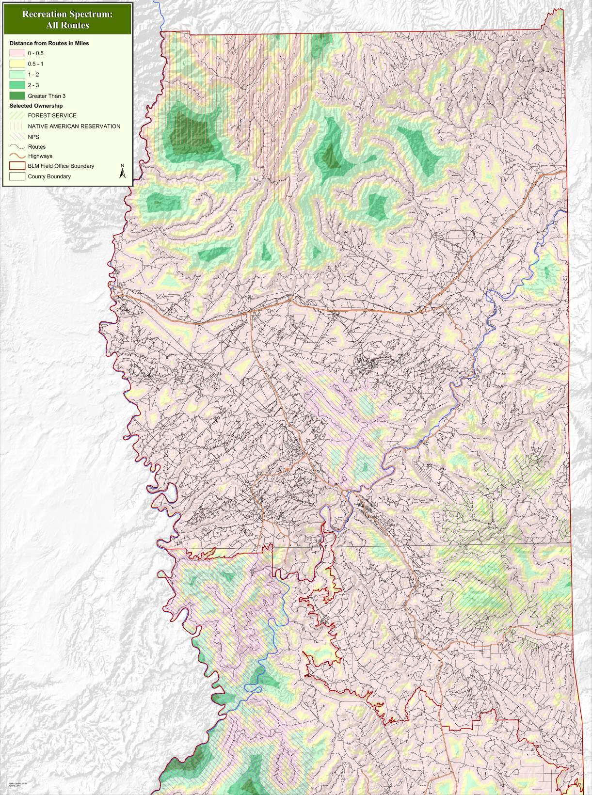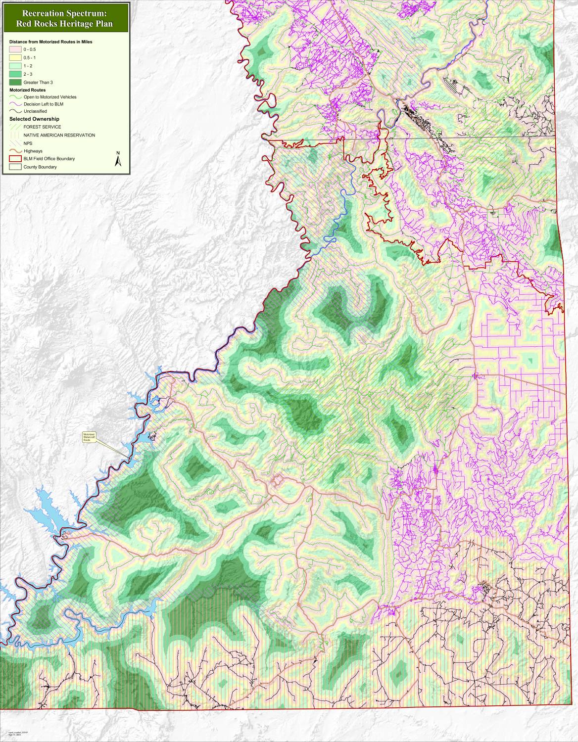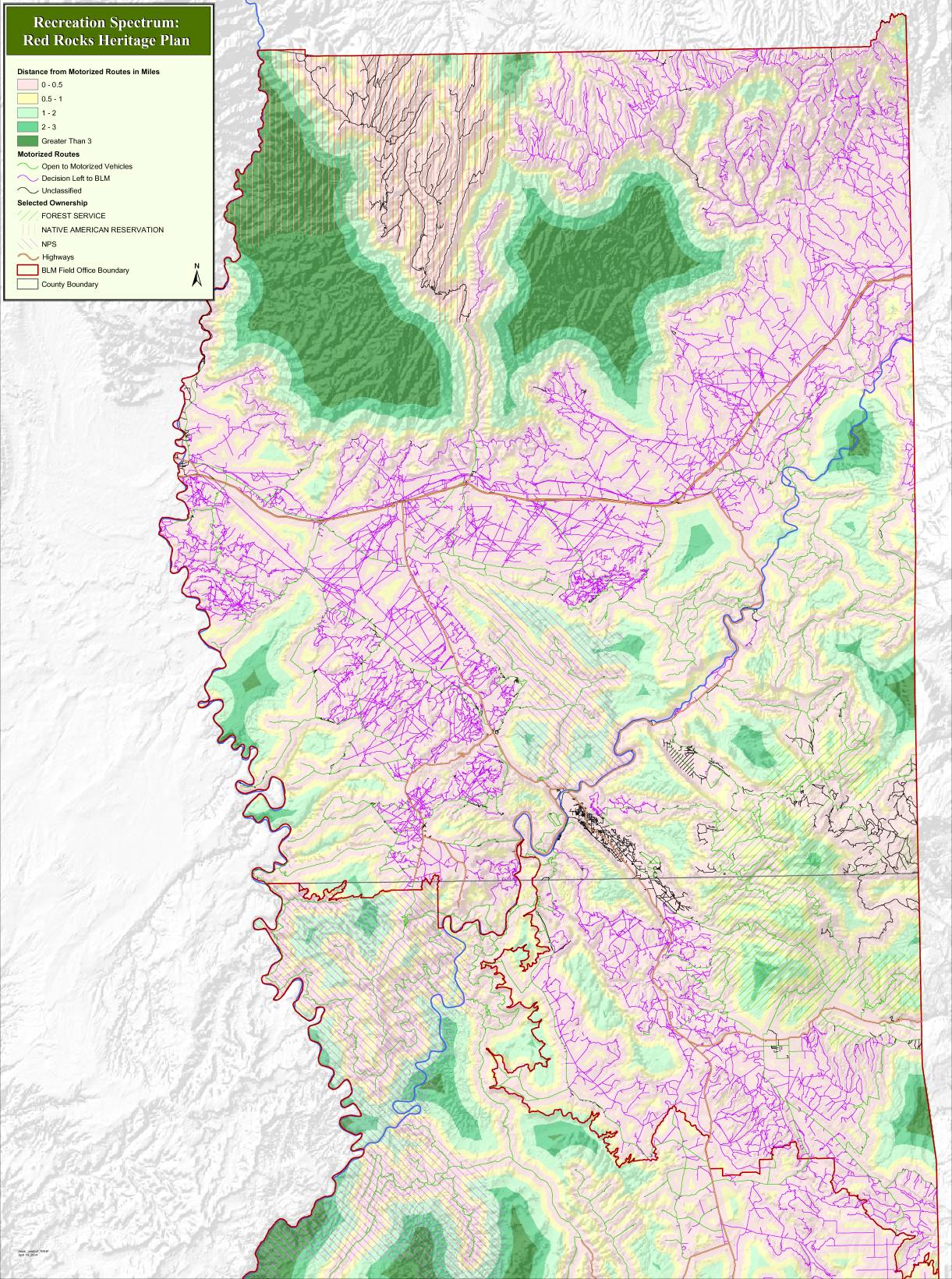 Recreation spectrum (road buffers), Monticello Field Office, Redrock Heritage Plan. PDF version (high quality, 3588 KB), JPEG version (lower quality, 520 KB) See also these recreational opportunity spectrum statistics. |